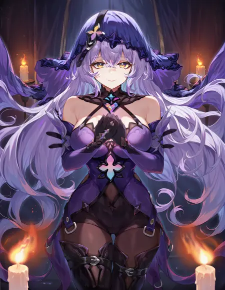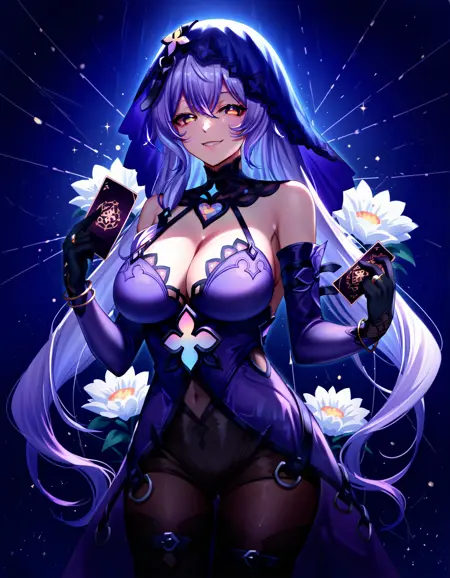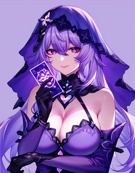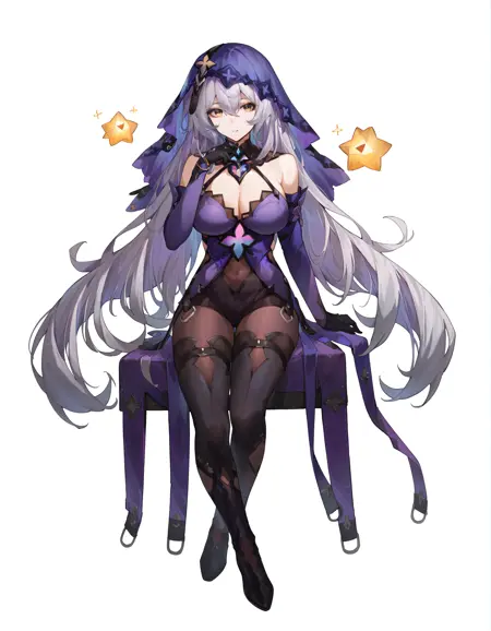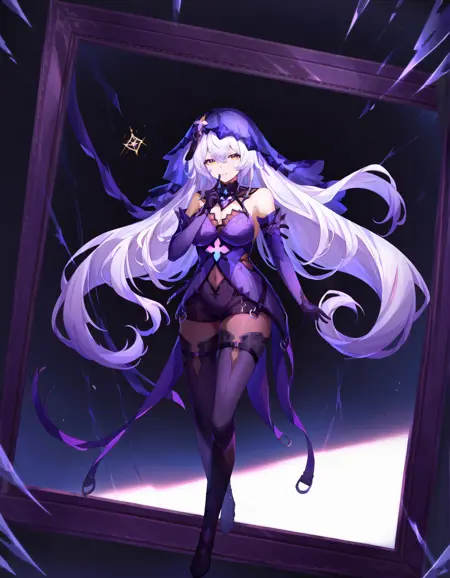 説明:長く流れる髪、紫色の目、優雅なドレスに焦点を当てた、黒いスワンの魅惑的な存在感を捉えます。洗練されたアクセサリーと表情豊かなポーズがキャラクターに深みを与え、シンプルな背景により彼女が常に注目される中心となります。