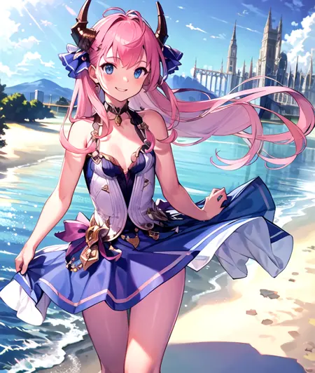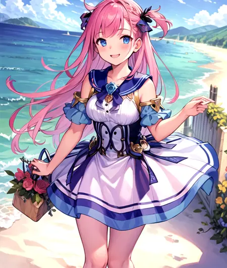 【ローザ】長いピンクの髪、1人の女の子、若い、単独、ローザ、青い目、スカート。