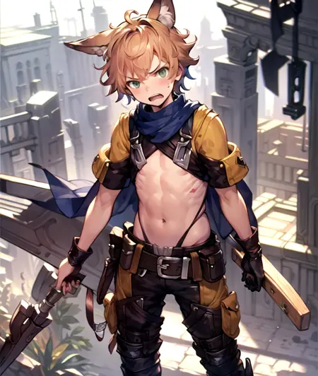 【カシム】1人の男の子、若い、(痩せている)、単独、カシム、緑の目、動物の耳、((細く弱い))