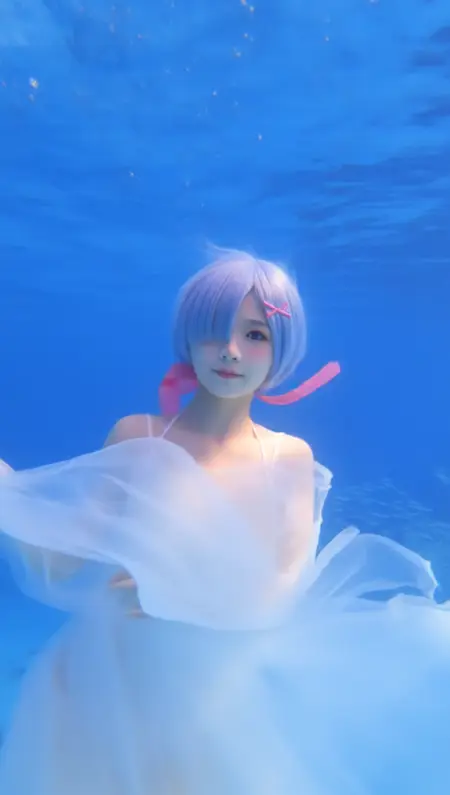 关键词:蓝色头发、侧 sweep 齐刘海、粉色丝带