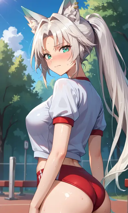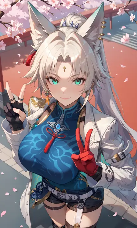 feixiao,水蓝色眼睛,白发,分层刘海,长发及地,马尾辫,狐狸耳,动物耳朵穿孔,额头宝石