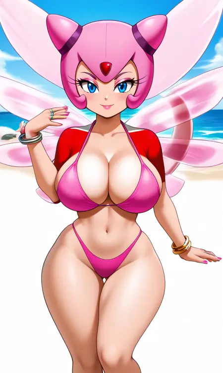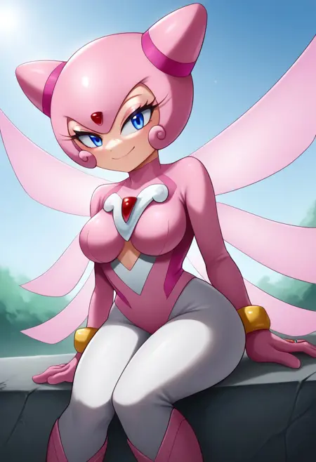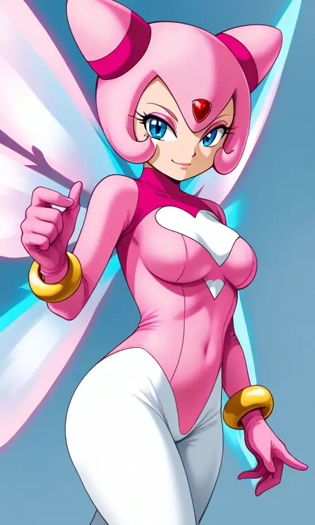 Lumina Flowlight, blue eyes, fairy, wings, pink headgear, pink gloves, ring bracelets, pink bodysuit, white pants