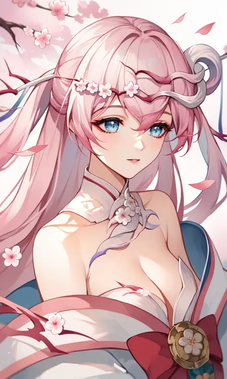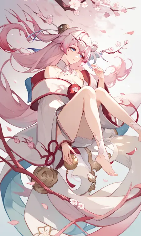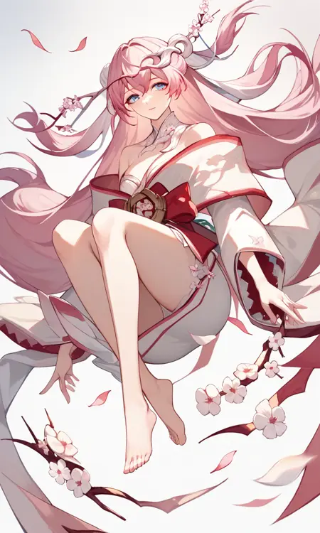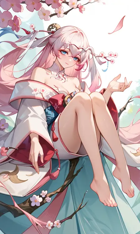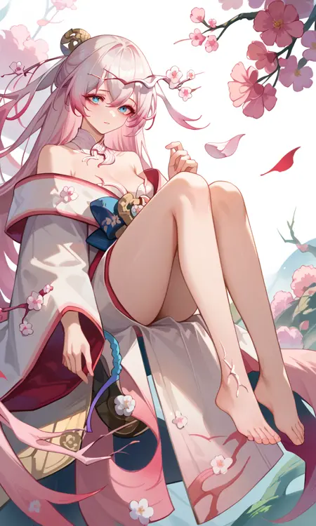 Shiki, pink hair, white hair, multicolored hair, extremely long hair, bang, hair between eyes, hair ornaments, blue eyes, cleavage, bare shoulder, detached collar, flowers, branches, japanese clothes, bare legs, bare feet