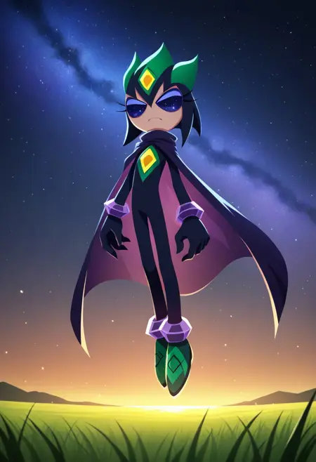 Void, dark blue tinted eyewear, green headgear, yellow gem in chest, dark blue cape, green shoes