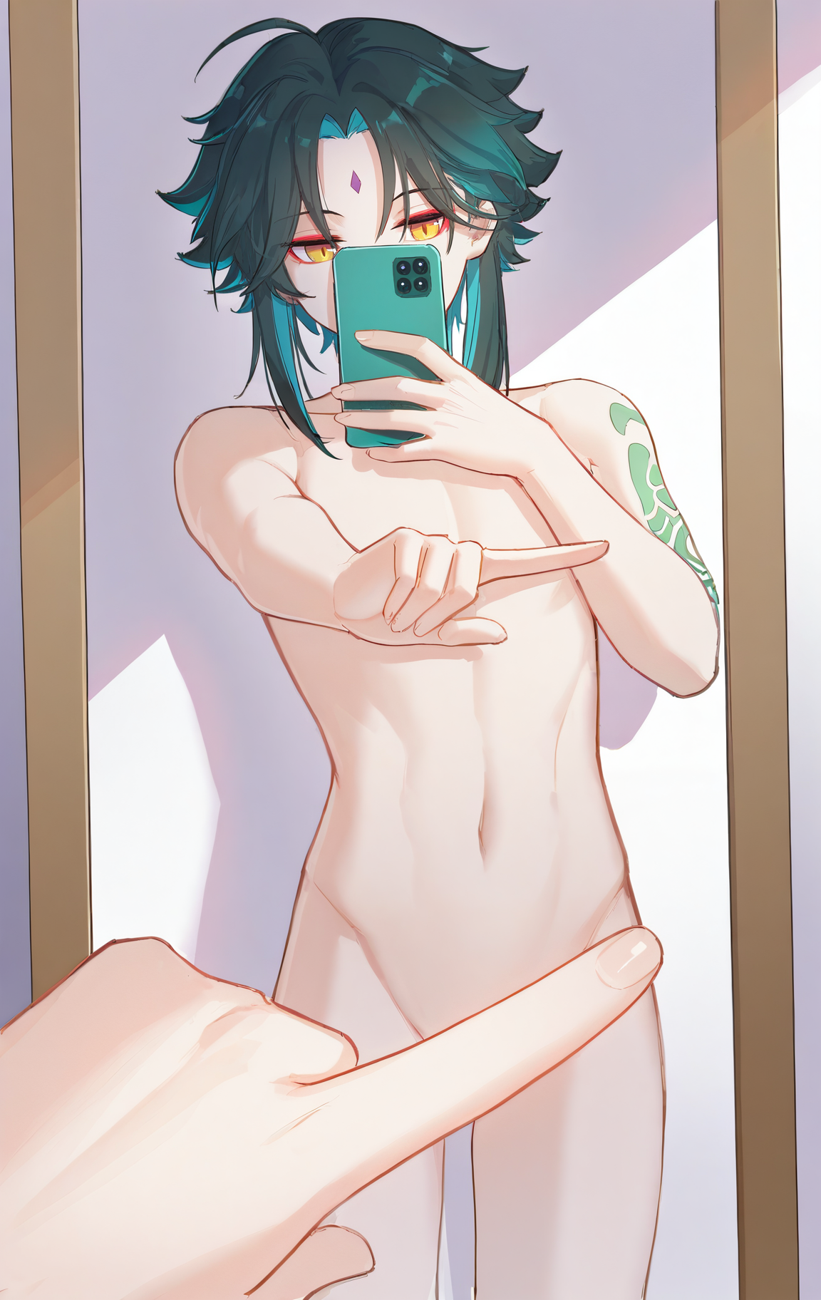 one finger selfie challenge (meme), covering privates, covering crotch, covering chest, male pov, holding phone, looking at mirror, nude, standing, selfie, reflection,