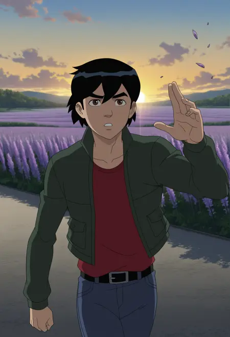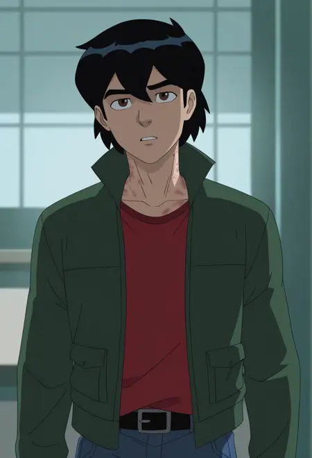 Amadeus Cho - Amadeus cho, black hair, brown eyes, green jacket, high collar jacket, long sleeves, red tshirt, blue jeans, black belt, red shoes