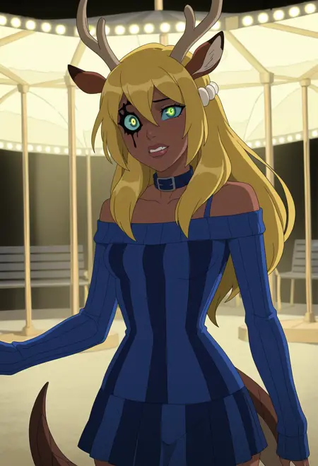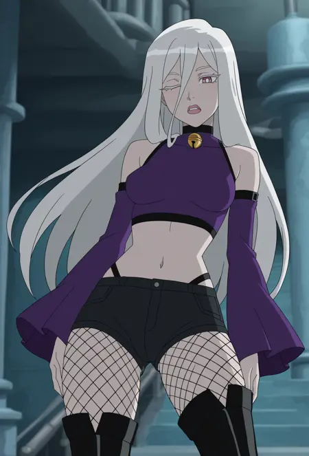 Dgger (makes dagger) - dggr, blonde hair, blue eyes, white bodysuit, long sleeves, high collar, face tattoo, white tattoo, crescent moon face tattoo