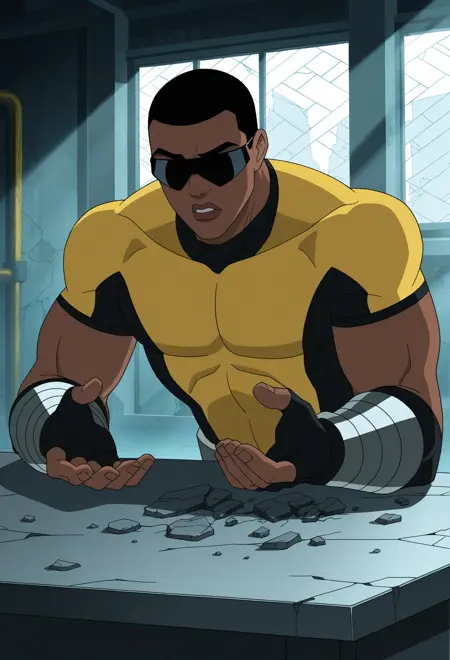 powerman - powerman, male, muscular, dark skin, shaved hair, black hair, brown eyes, short sleeves, body suit, multicolored body suit, black body suit, yellow body suit, glasses, sunglasses, black glasses, silver bracers, fingerless gloves, black gloves