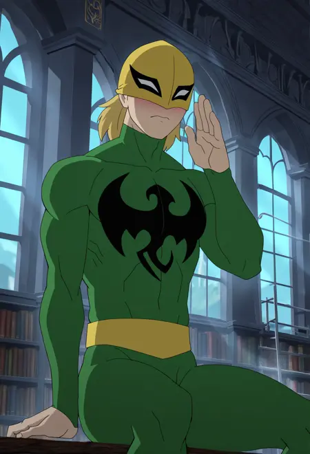 ironfist - ironfist, BLONDE HAIR, upper-face mask, yellow mask, green bodysuit,yellow belt, dragon emblem, chest emblem, /OR/ dannyrand, blonde hair, green eyes, high collar, sleeveless, chest armor, green robes, gold robes, multicolored robes, chest emblem (THE SECOND PROMPT HAS LITTLE DATA, RESULTS WILL BE FUCKED)