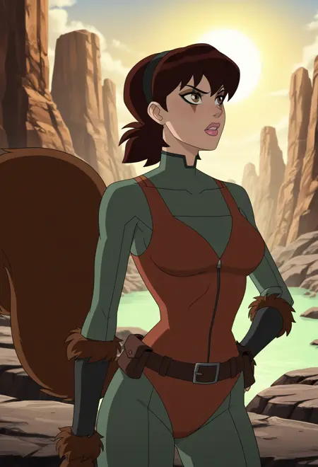 SQRLGRL (makes squirrel girl) - SQRLGRL, brown hair, short hair, brown eyes, pink lips, upside-down triangle eye makeup, headband, leotard, brown leotard, v-neck, body suit, bodysuit, green bodysuit, belt, utility belt, highneck bodysuit, bracers, fur bracers,