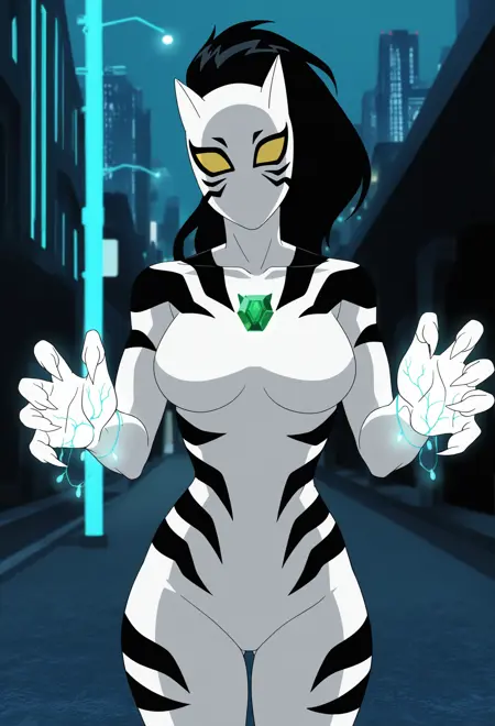 whitetiger - whitetiger, white bodysuit, claws, belt, high ponytail, black hair, yellow eyes, black stripes, tiger stripes, black eyeliner, green gem, tiger gem, chest gem