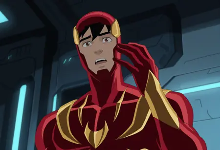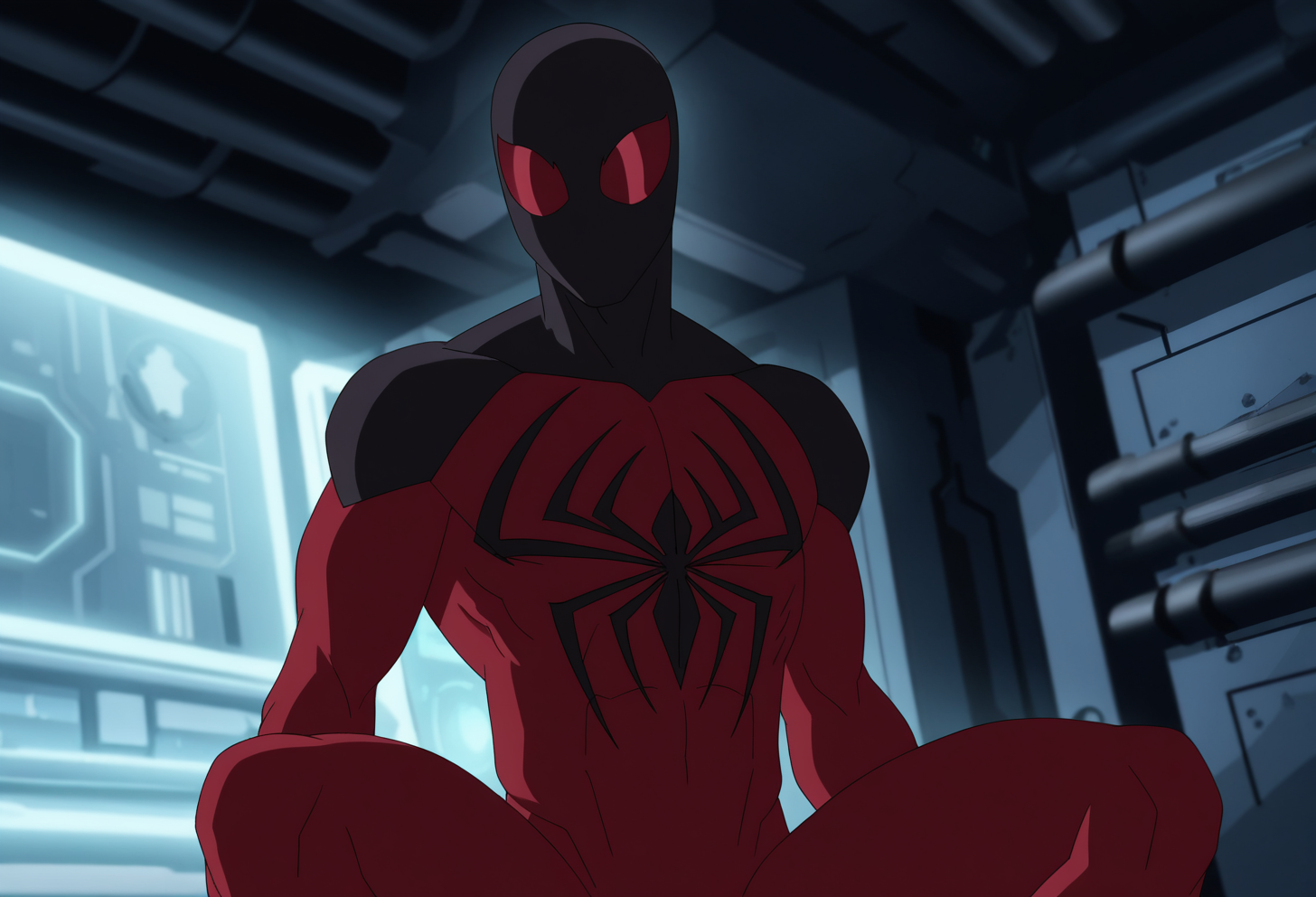 Kidarachnid - kidarachnid, black bodysuit, red spider emblem, chest emblem, no mask /or/ kidarachnid, black bodysuit, red spider emblem, chest emblem, mask, white eyes