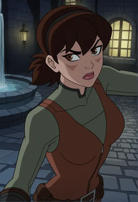 SQRLGRL(スカイールガールを生成) - SQRLGRL, brown hair, short hair, brown eyes, pink lips, upside-down triangle eye makeup, headband, leotard, brown leotard, v-neck, body suit, bodysuit, green bodysuit, belt, utility belt, highneck bodysuit, bracers, fur bracers,