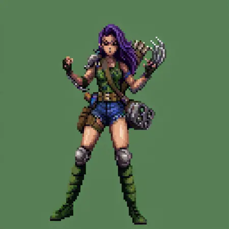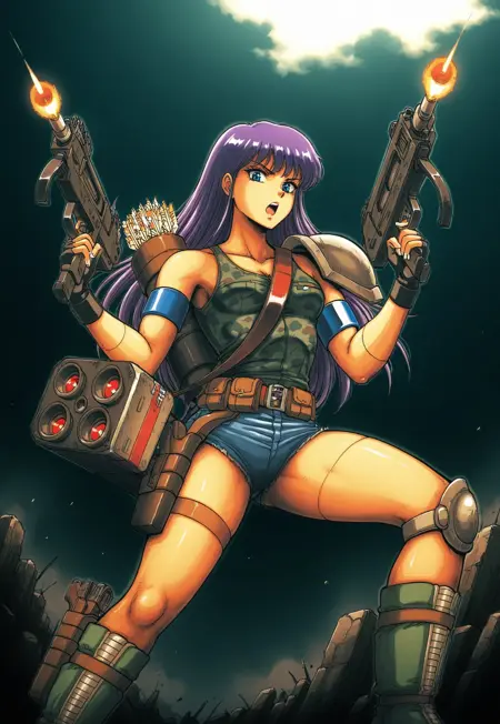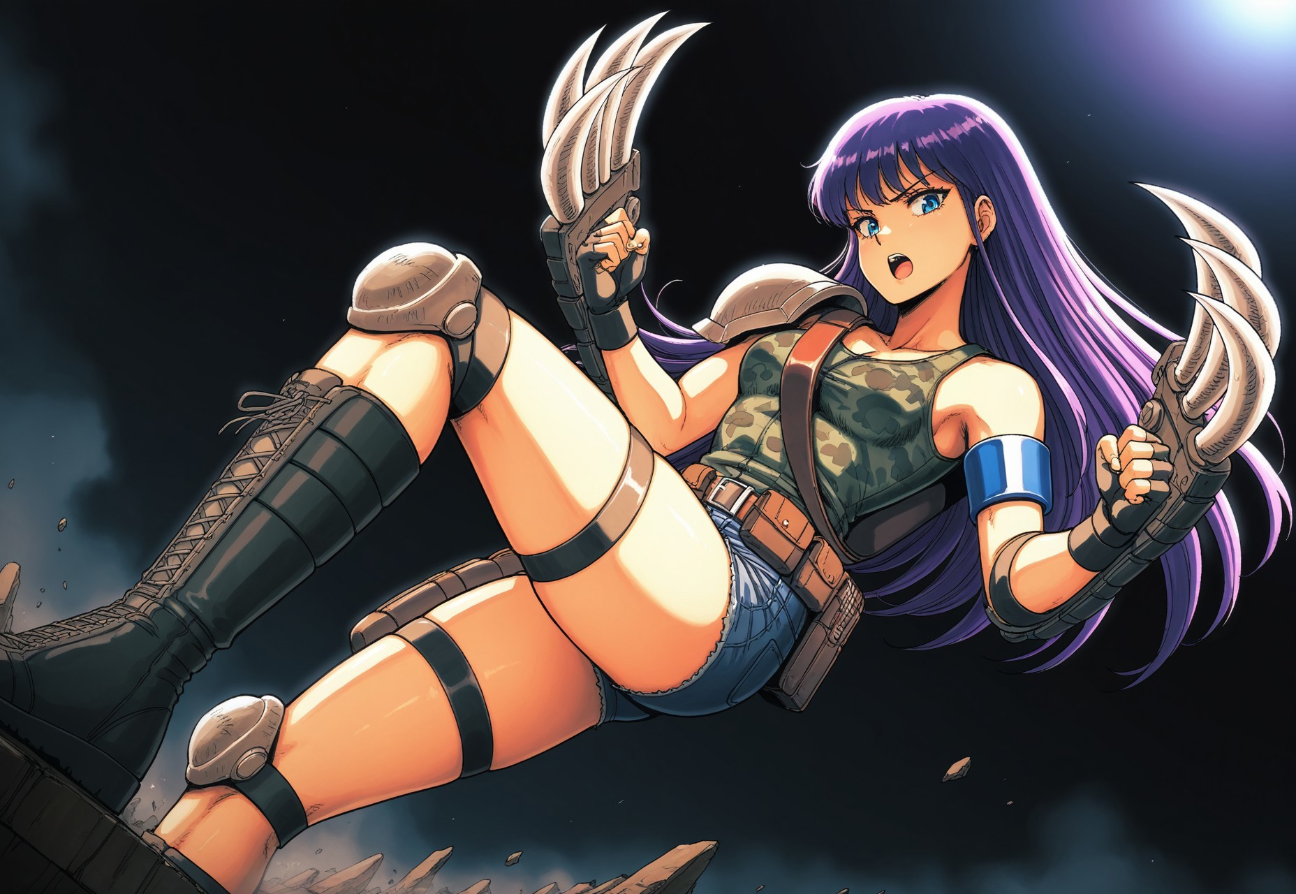 1girl, female focus, long hair, purple hair, blue eyes, single pauldron, camouflage tank top, fingerless gloves, belt, pouch, holster, denim shorts, knee pads, green boots, single armband, legbands