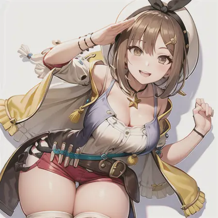 masterpiece, best quality, ultra-detailed,1girl, atelier ryza,reisalin stout, solo, shorts, brown hair, thighhighs, brown eyes, short shorts, gloves, belt, white background, breasts, red shorts, jewelry, hat, hair ornament, hairclip, single glove, simple background, necklace, star (symbol), white headwear, looking at viewer, thighs, star necklace, :d, brown gloves, sleeveless jacket, cleavage, holding, salute, short hair, brown thighhighs, jacket, flask, blush, beret, medium breasts, bangs, sleeveless, brown belt, white thighhighs, blue belt, round-bottom flask, boots, yellow jacket, cowboy shot, collarbone,(cowboy shot:1.1), (looking at viewer:1.2), from above, breast press, on bed, lying, medium breasts, cleavage, black hair, (long hair:1.1) bangs, (uneven twintails:1.1), blush, (smirk:1.1), spirit form, sleeveless dress, frilled dress, multicolored dress, orange dress, red dress, black dress, detached sleeves, black panties, black thighhighs, frilled choker, black choker, bed sheets lora:reisalinStoutAtelier\_delta:1