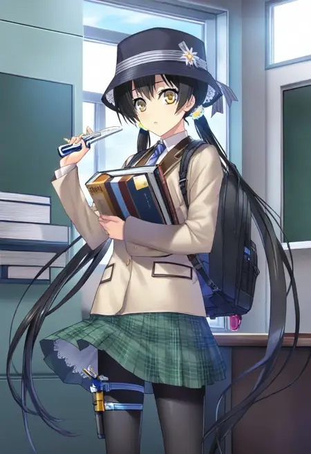 {school uniform, hat, backpack, boxcutter | short jumpsuit, hat, boxcutter | layered kimono, circlet, sakazuki}