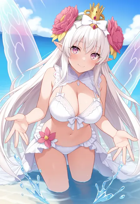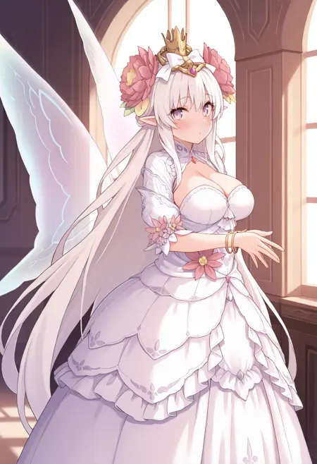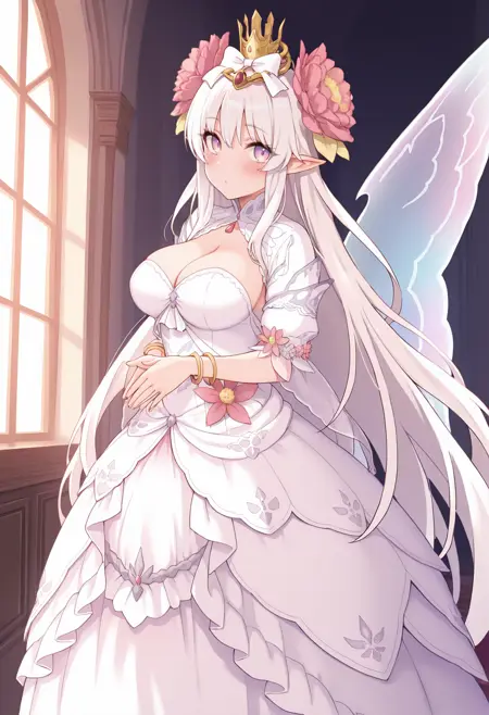 pcrminerva, 白髪, 尖った耳, 非常に長い髪, 髪飾り, 髪のリボン, 王冠, 大きな胸, 白いドレス, シャラップ(衣装), ジュエリー, 胸元, 花, ブレスレット, fairy wings, 長いドレス,