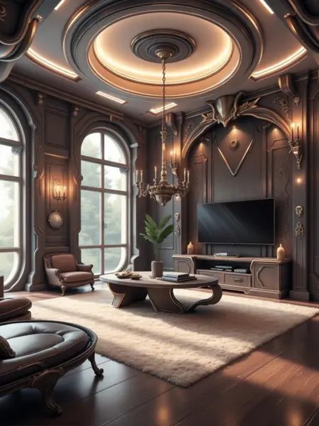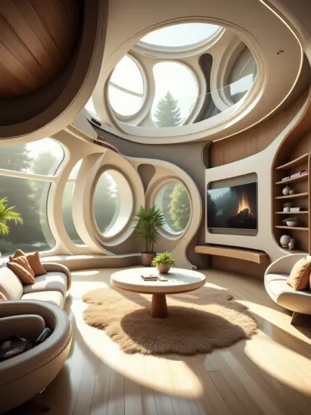 - インテリアデザインの未来...、円形の鏡を通じて魚眼ビューが見える。鏡は薄い青い壁に設置され、白い壁と鮮やかなコントラストを形成している。鏡は薄い青い壁に設置され、白いベッドリネンと鮮やかな対比を生み出している。ベッドにはクリーム色の毛布がかけられ、シーンに色合いを加えている。部屋の内装には白い椅子が飾られている。