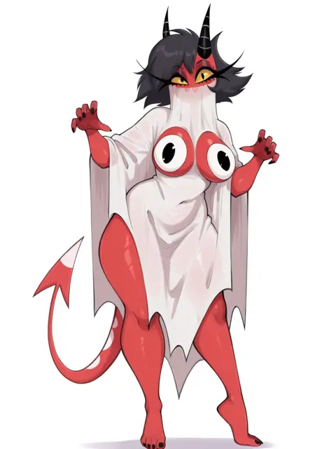 提示词:millie_helluva_boss,角,尾巴,红色皮肤,黄色虹膜,长睫毛,