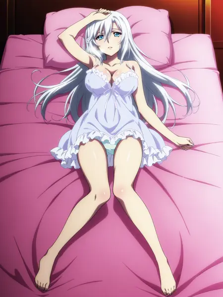 关键要素: 长发、白发、头发遮眼、蓝眼睛、睫毛、大乳房