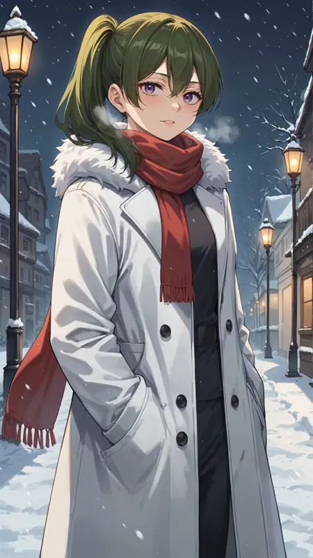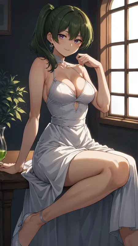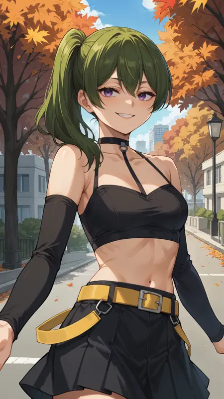 dark green hair, side ponytail, purple eyes, black dress, sleeveless, black choker, armlet, halter dress, short dress, belt, straps, black glove, single glove