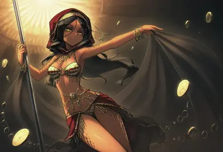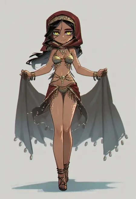 dancer, dancer's outfit, harem outfit, o-ring, o-ring top, skirt, showgirl skirt, hood, veil, shawl, jewelry, bracelet, necklace, sandals,