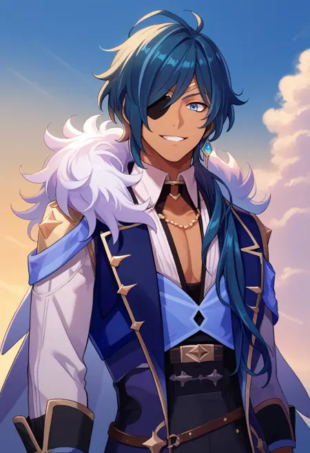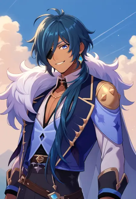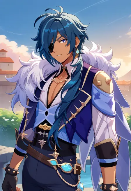 kaeya, 1boy, male focus, solo, dark skin, dark-skinned male, blue eyes, eyepatch, blue hair, bangs, antenna hair, long hair, ponytail, hair over shoulder, jewelry, earrings, shirt, blue shirt, jacket, blue jacket, fur trim, cape, white cape, gloves, fingerless gloves, belt, vision (genshin impact), pants, blue pants, boots, black footwear,