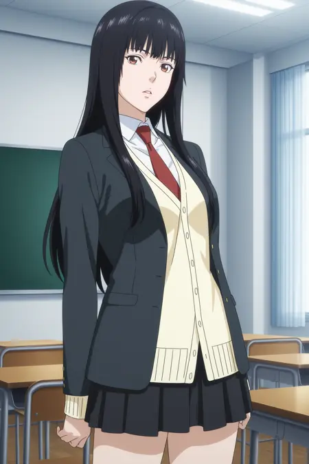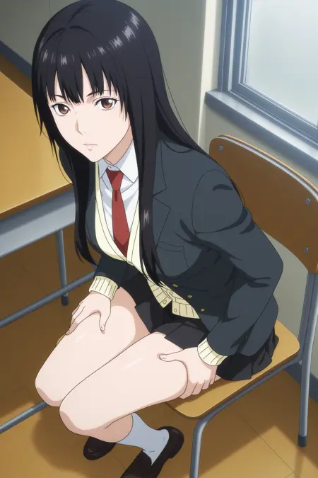 inuyashiki mari, long hair, black hair, brown eyes, school uniform, blazer, black jacket, white shirt, collared shirt, red necktie, yellow cardigan, black skirt, pleated skirt, white kneehighs, loafers