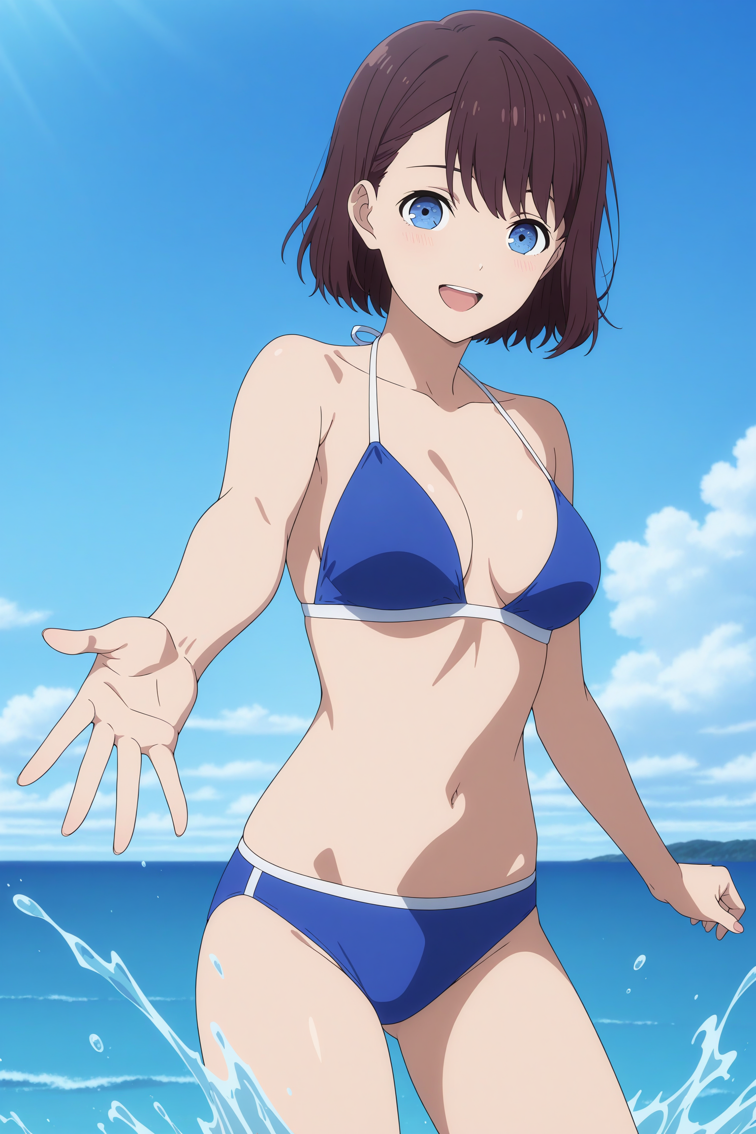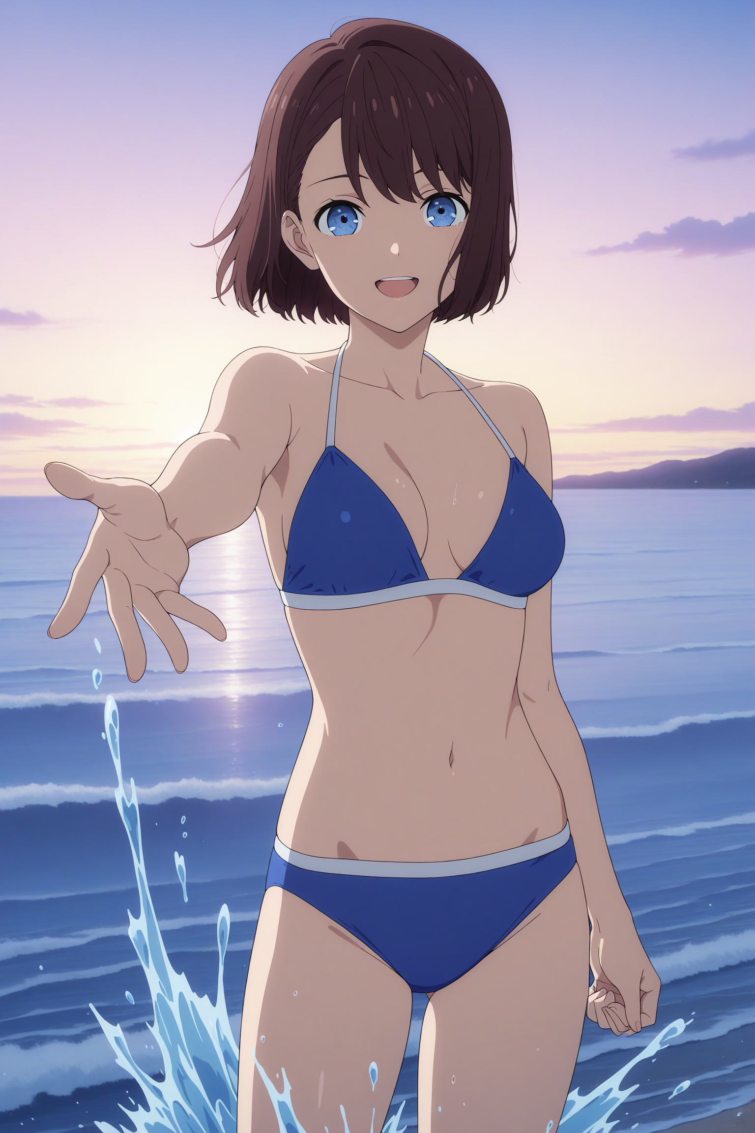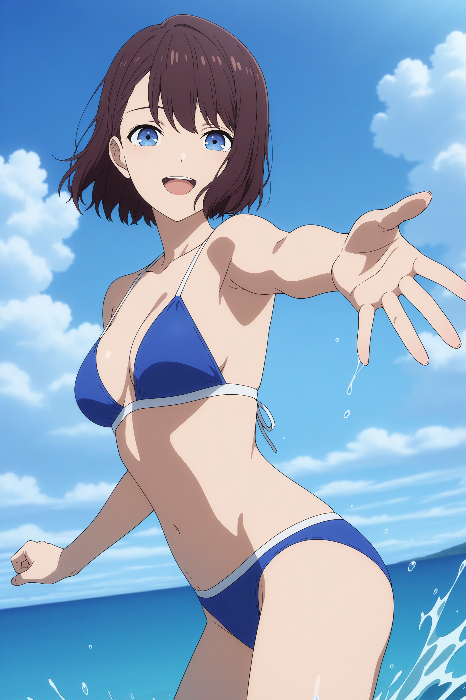 ninomiya mai, brown hair, short hair, asymmetrical bangs, blue eyes, bikini, blue bikini