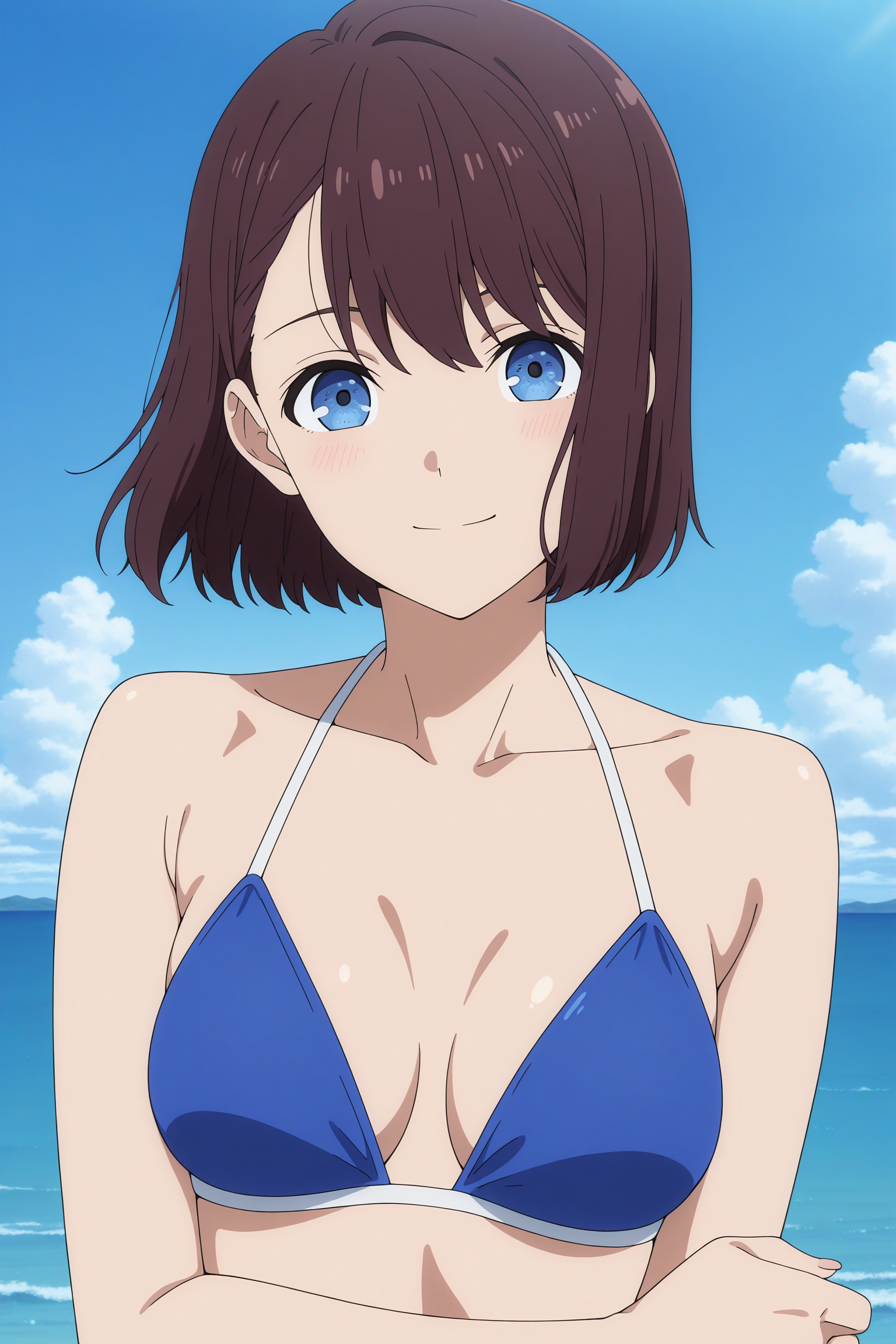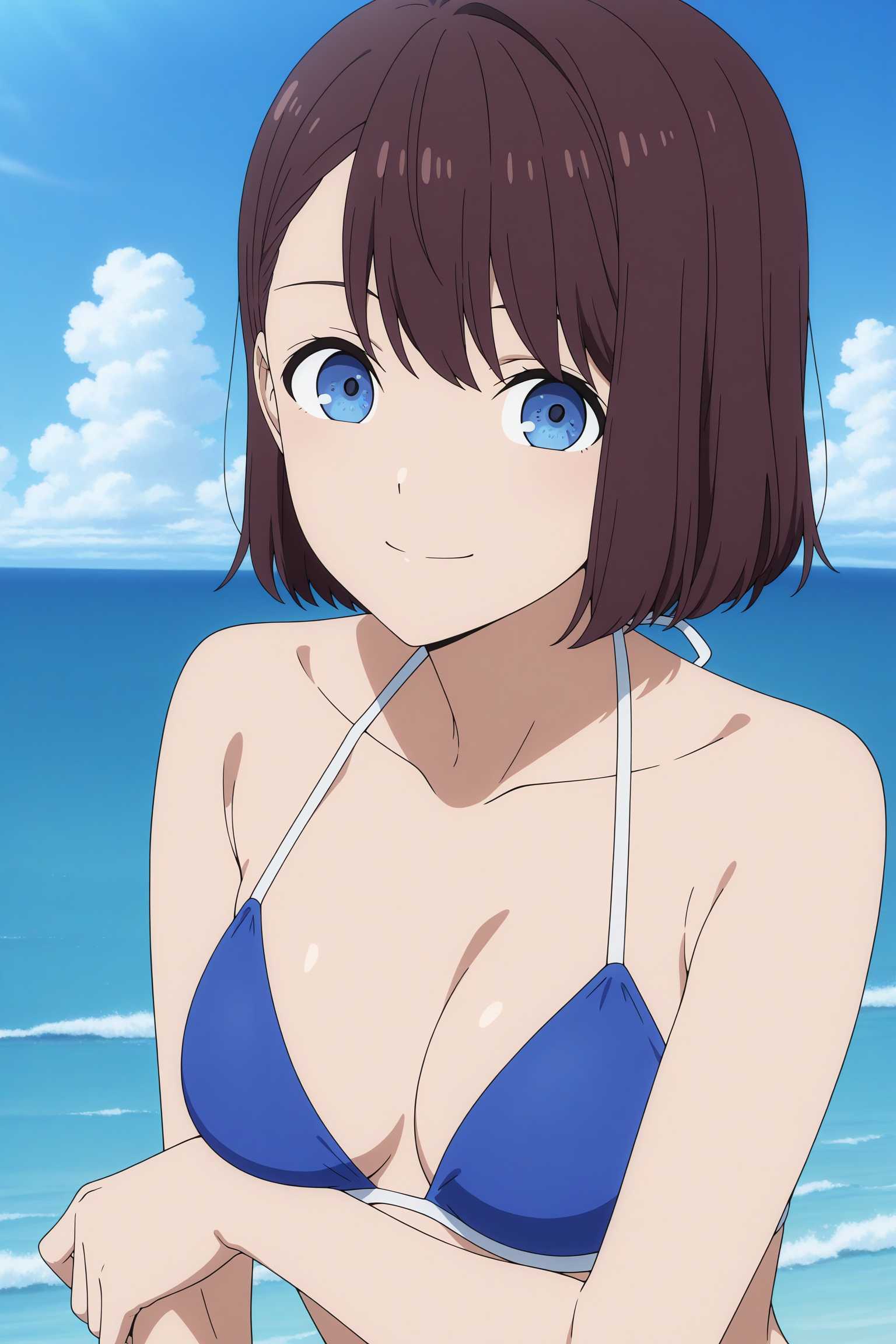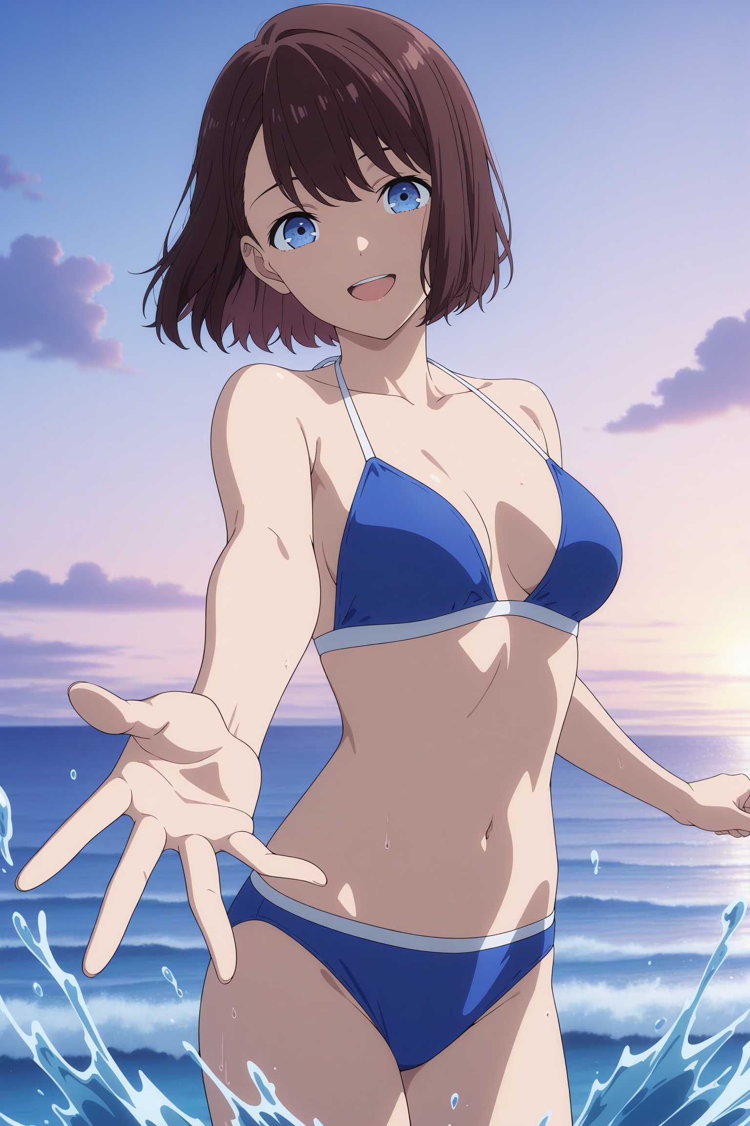 ninomiya mai, brown hair, short hair, asymmetrical bangs, blue eyes, bikini, blue bikini