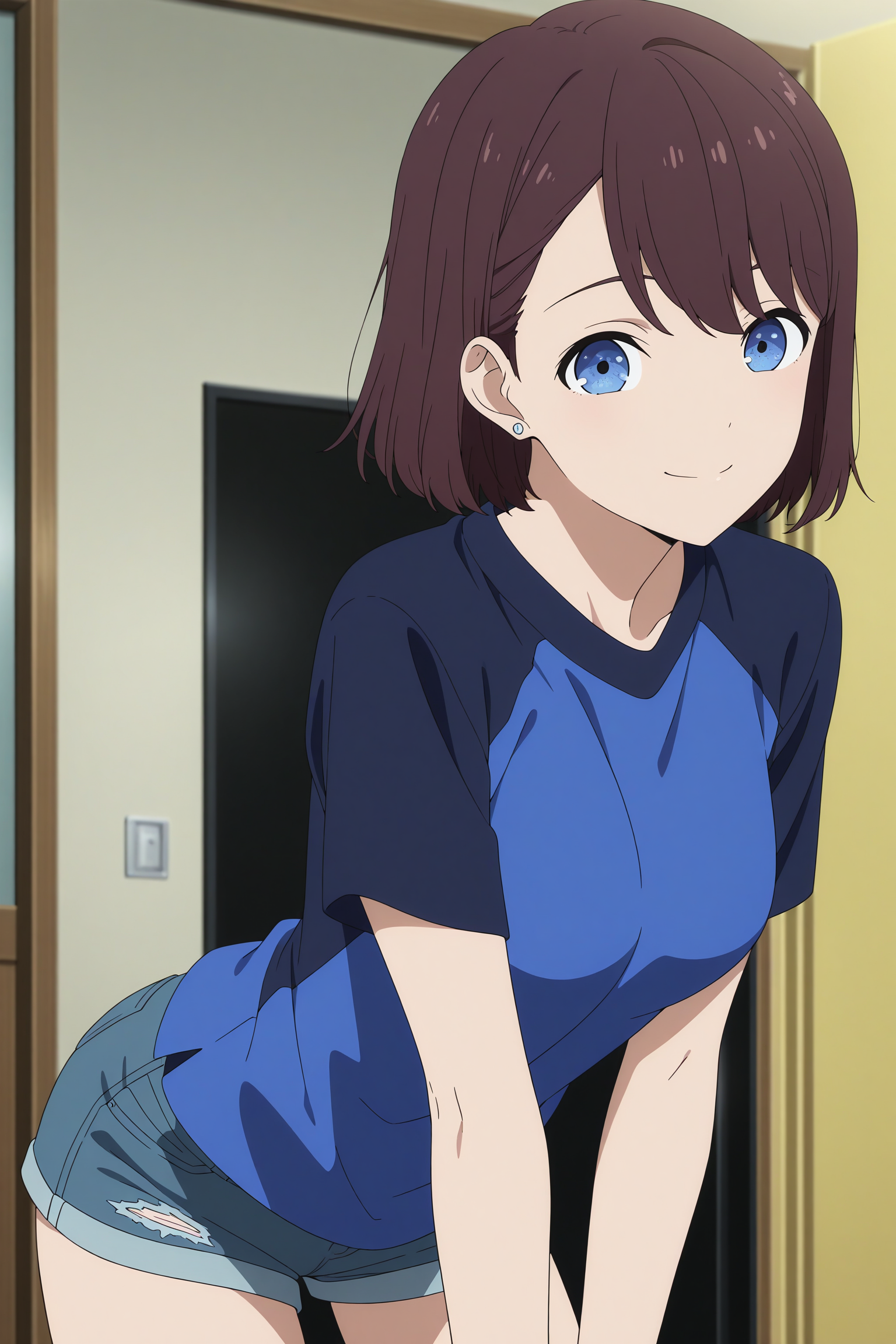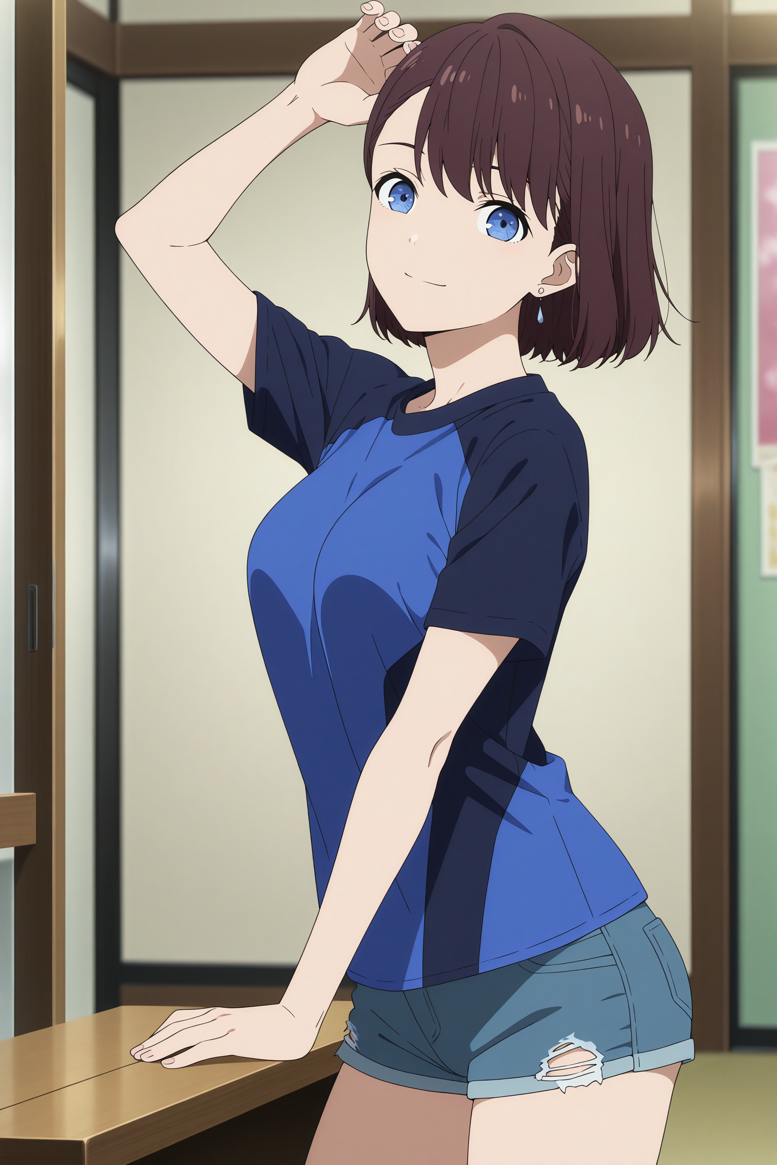 ninomiya mai, brown hair, short hair, asymmetrical bangs, blue eyes, earrings, short sleeves, raglan sleeves, blue shirt, multicolored shirt, short shorts, denim shorts, red footwear, sneakers