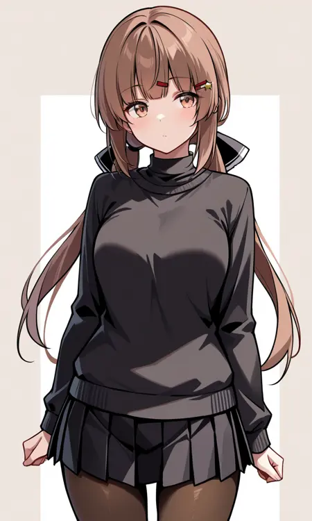 下着衣装: tashkentinneKC,茶色の髪,茶色の目,長い髪,髪の飾り,長袖,髪のリボン,プリーツスカート,赤いヘアクリップ,黒スカート,黒シャツ,黒リボン,低めのツインテール,茶色のパンスト,黒セーター,