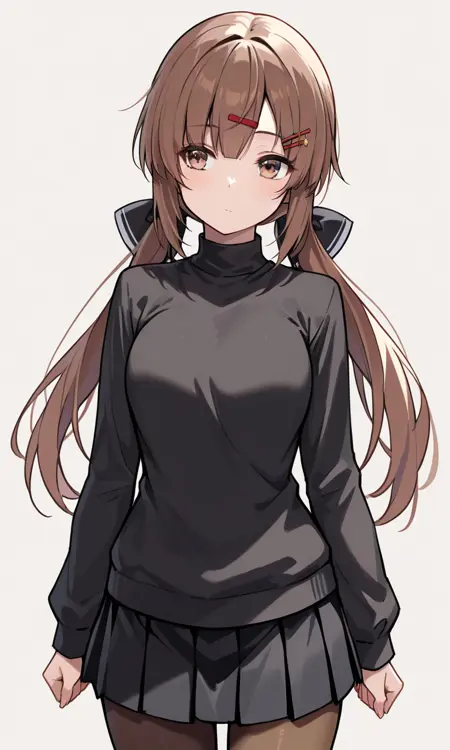 内衣服装: tashkentinneKC, 棕色头发, 棕色眼睛, 长发, 头饰, 长袖, 发带, 百褶裙, 红色发夹, 黑色短裙, 黑色上衣, 黑色蝴蝶结, 低双马尾, 棕色连裤袜, 黑色毛衣,