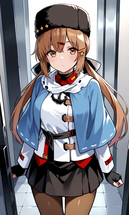 默认服装: tashkentKC, 棕色眼睛, 棕色头发, 侧发辫, 发带, 发夹, 低双马尾, 衬衫领, 头饰, 帽子, 星星(符号), 黑色手套, 无指手套, 黑色短裙, 黑色头饰, 黑色蝴蝶结, 白色夹克, � ribbon 装饰, 黑色腰带, 棕色连裤袜, 白色围巾, 毛皮帽, 衬衫未塞入, 巴塔克帽, 破损围巾, 锚形项链, 蓝色披肩, 黑色巴塔克帽,