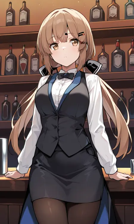 调酒师 服装: tashkentbarKC, 棕色眼睛, 棕色头发, 长发, 头饰, 长袖, 白色衬衫, 发带, 红色发夹, 黑色短裙, 黑色连裤袜, 黑色蝴蝶结, 低双马尾, 铅笔裙, 棕色连裤袜, 黑色背心, 调酒师, 腰部斗篷,