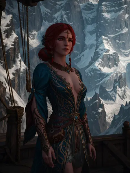 例:talojitriss wearing dlcoutfit standing in a ship, snowy mountain range in the background;talojitriss wearing defaultoutfit standing in the forest。