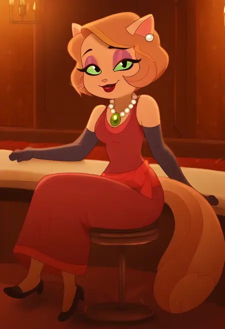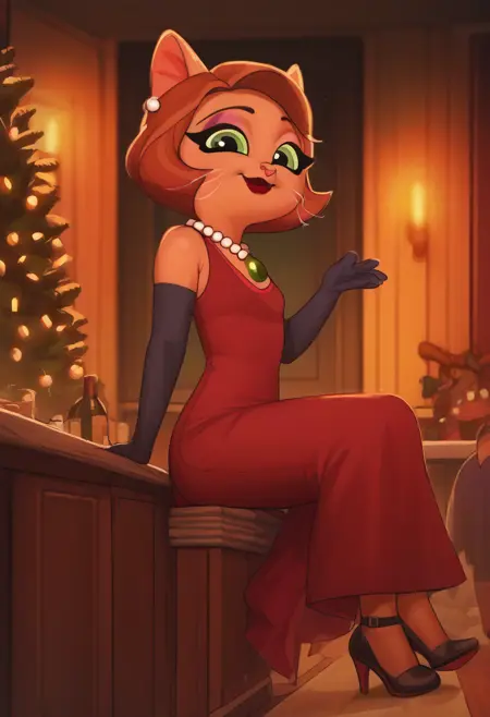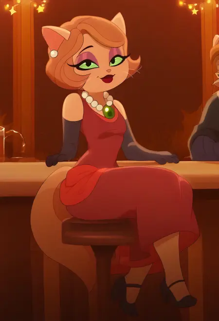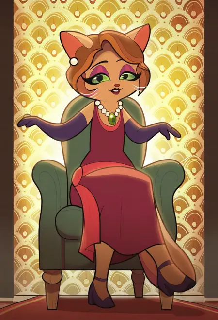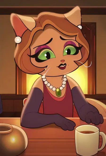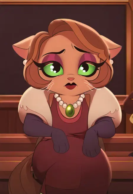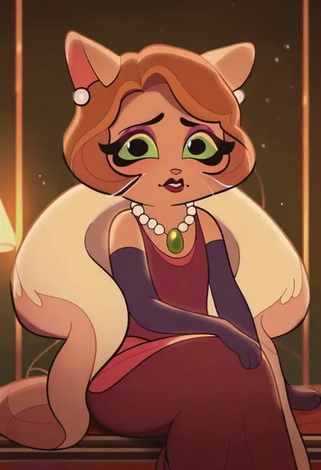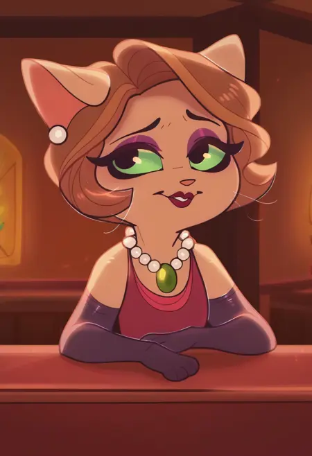 メインプロンプト: mitzi may, 猫娘, 猫の耳, 茶色の髪, 淡い緑の目, 濃い茶色の毛並み, もふもふの尾, 赤いリップ, 紫のアイシャドウ