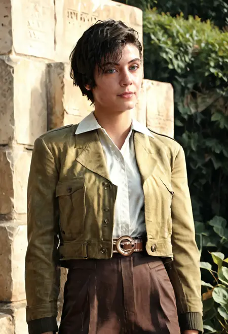 彼女のゲーム衣装:マスタード色のジャケット、白シャツ、プリーツ入りのハイウエストの濃い茶色のズボン、円形のバックル付きベルト