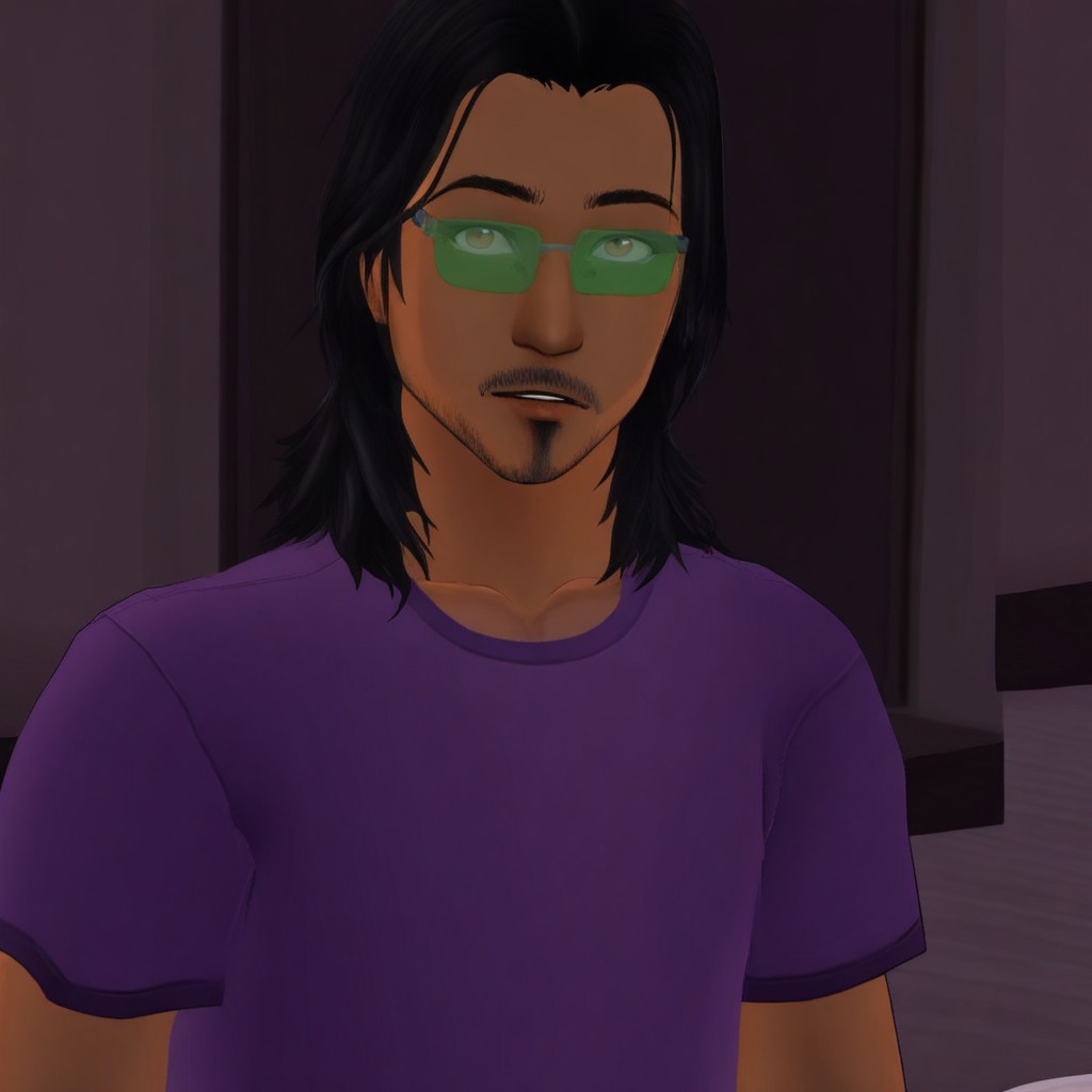 1man, black hair, ((medium hair)), brown eyes, green sunglasses, ((tanned skin)), beard stubble, purple t-shirt,jeans