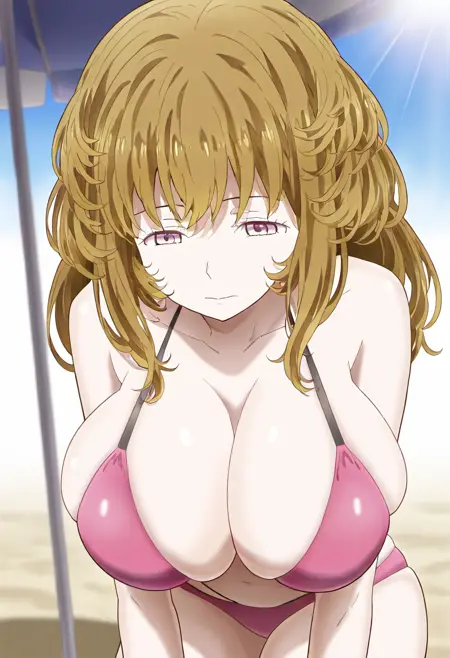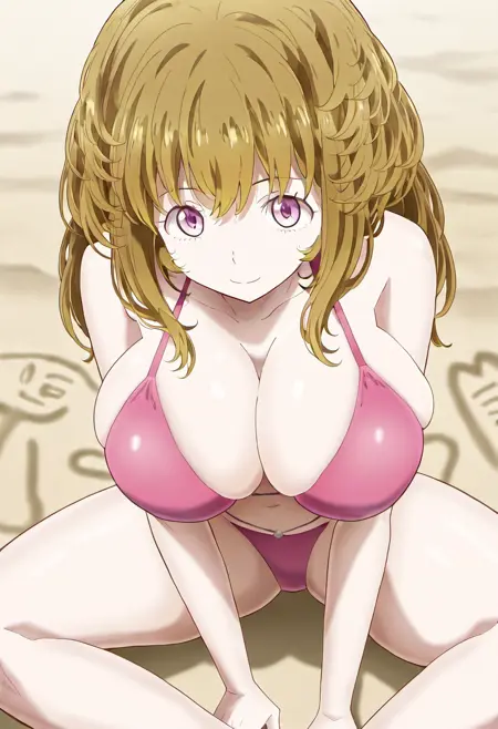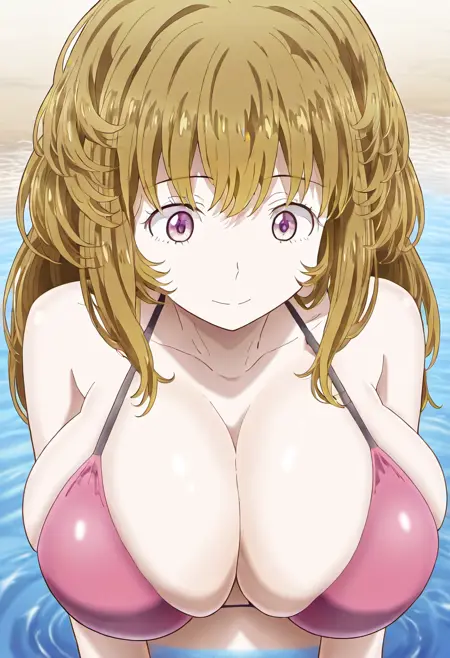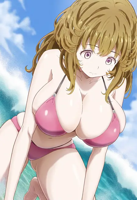 一般的なプロンプト: 紫色の目、非対称な前髪、大きな胸、茶色の髪、長い髪