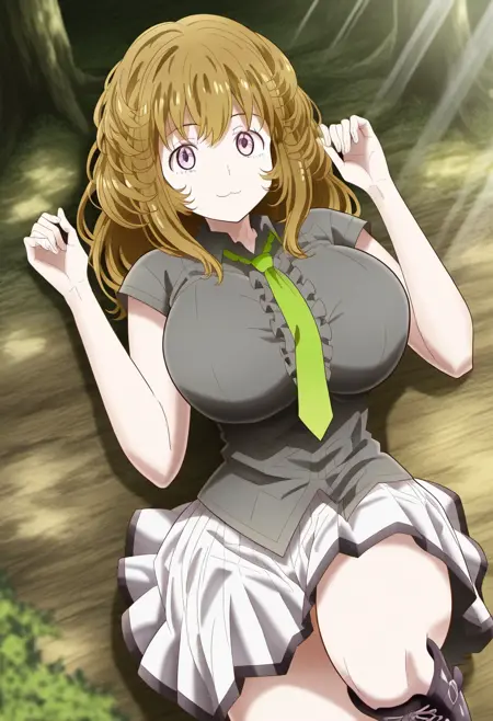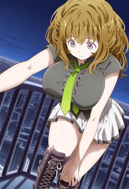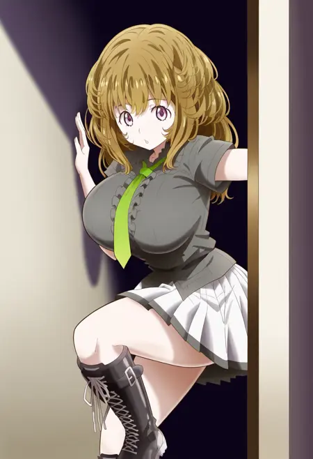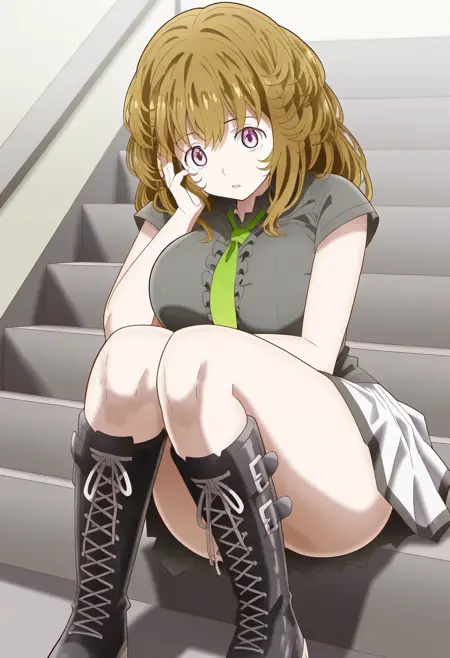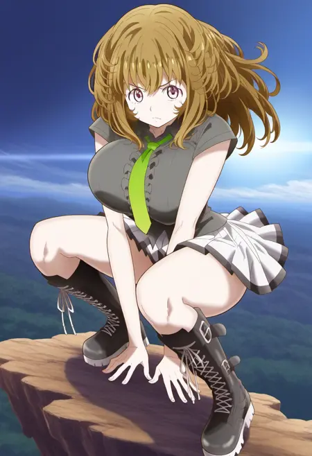 衣装プロンプト A: 緑色のネクタイ、灰色のシャツ、短い袖、白いスカート、黒いトリム、レースアップブーツ、ブーツ