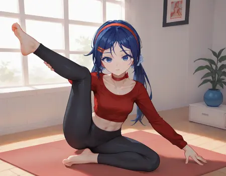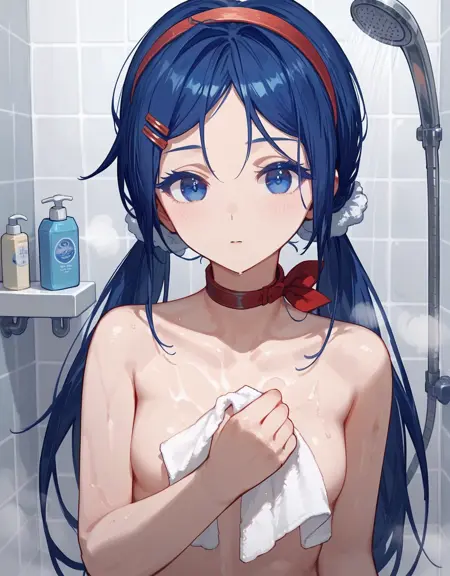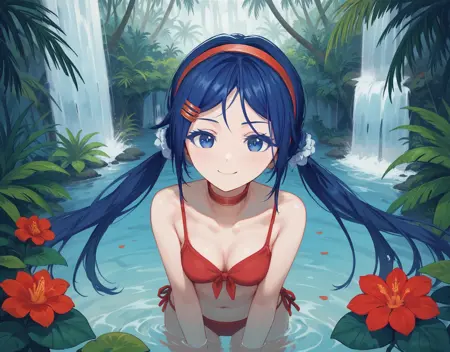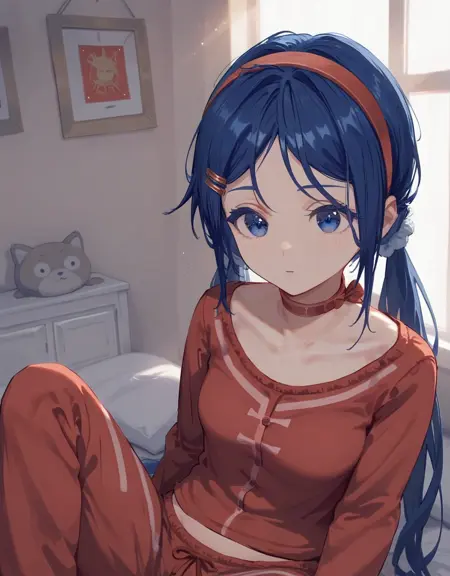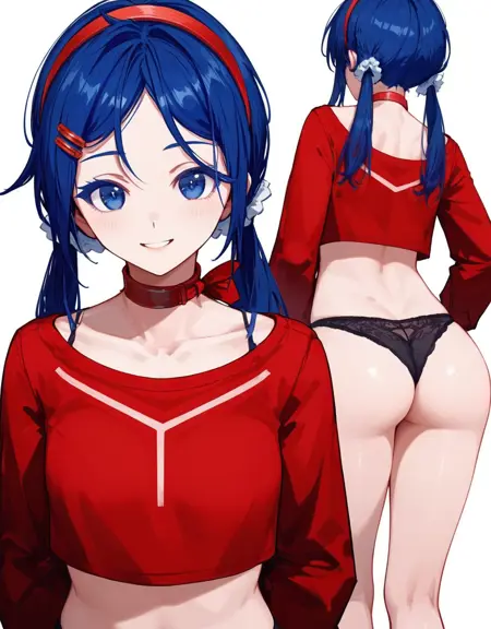 基本的なプロンプト(オリジナルの衣装): lora:mitabaza:0.7 mitabaza, itsmita 1girl, hair ornament, long hair, hairband, hairclip, twintails, blue eyes, red hairband, choker, long sleeves, shirt, collarbone, red shirt, (dark-blue hair:0.8), (medium breasts:0.9)