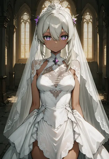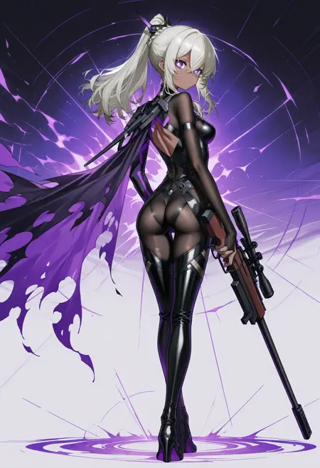For generation, I use: 'NemesisCute, 1girl, dark-skinned female, dark skin, medium breasts, long hair, white pupils, ponytail, grey hair, bangs, hair ornament, hair between eyes, purple eyes, lora:NemesisCute:1'.