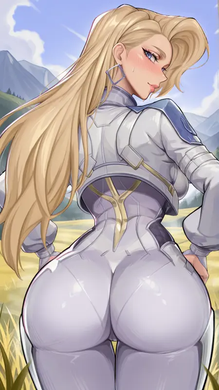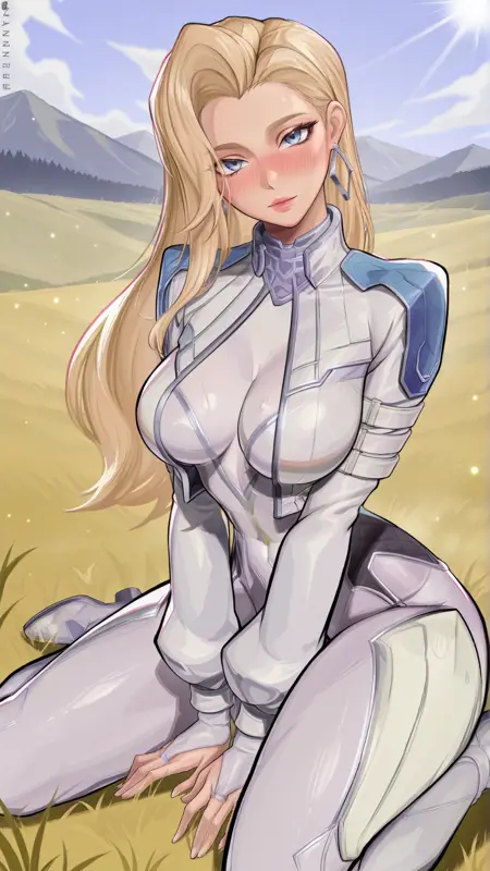 dagger_mvr, blue eyes, blonde hair, long hair, hair behind ear, hoop earrings, white bodysuit, skin tight, white jacket, cropped jacket, white footwear, white gloves, bridal gauntlets,