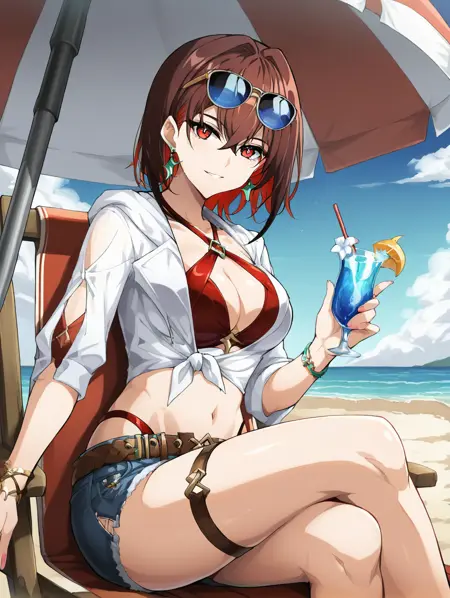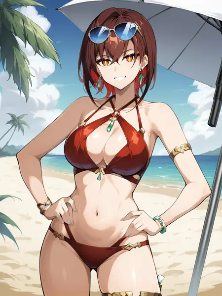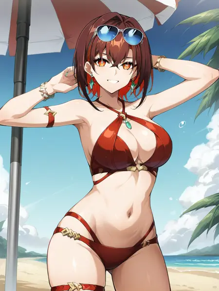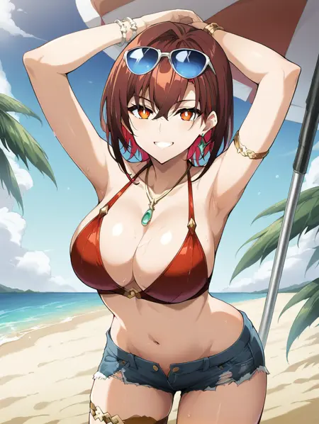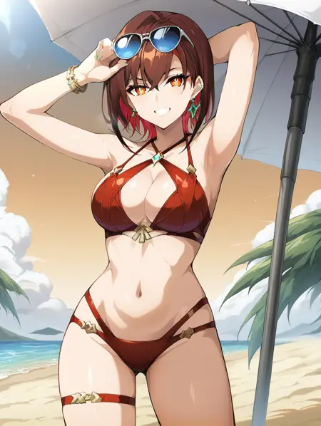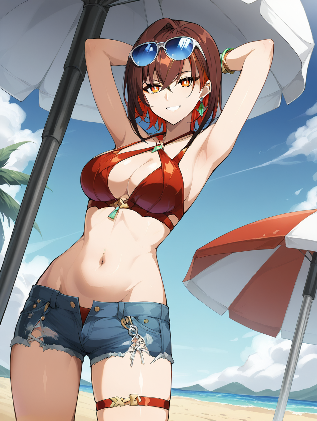 | 训练词汇 | ming,1girl, Mature women,solo, breasts, looking at viewer, smile, short hair, brown hair, shirt, navel, cleavage, jewelry, swimsuit, white shirt, short sleeves, bikini, red hair, multicolored hair, cowboy shot, earrings, outdoors, sky, shorts, day, midriff, belt, cloud, grin, bracelet, tree, orange eyes, hand on hip, short shorts, thigh strap, ocean, halterneck, umbrella, beach, sunglasses, denim, eyewear on head, red bikini, denim shorts, palm tree, criss-cross halter, tied shirt, beach umbrella已复制! |