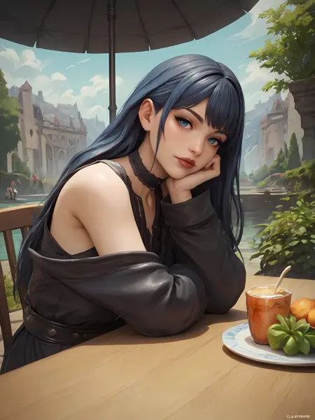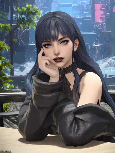 lora:gaia\_FF14\_Illustrious:1, gaiaFF14, blue eyes, long hair, black hair, blue hair, bangs, lips, choker, gothic,