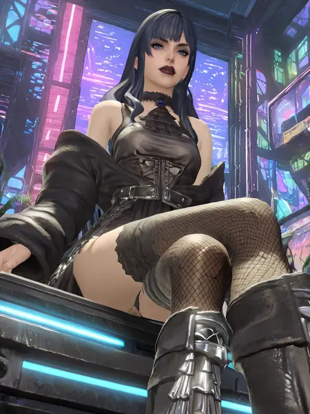 lora:gaia\_FF14\_Illustrious:1, gaiaFF14, blue eyes, long hair, black hair, blue hair, bangs, lips, choker, gothic,