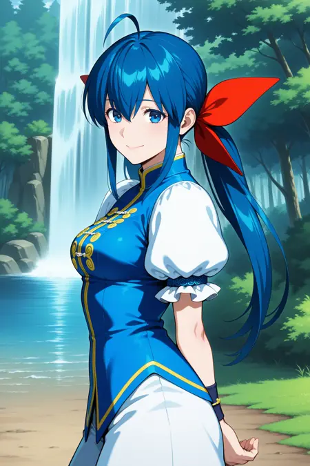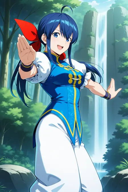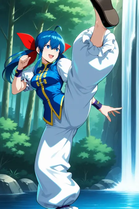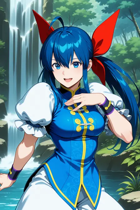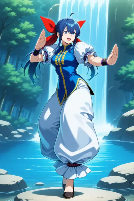 futaba hotaru, long hair, blue hair, twintails, hair bow, hair between eyes, sidelocks, ahoge, chinese clothes, puffy short sleeves, wristband, baggy pants, flats