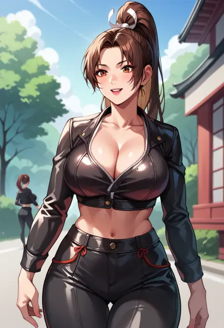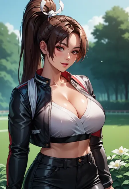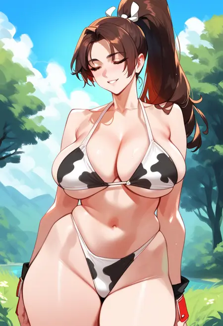 Trigger: ponymai, ponytail, brown hair female, large breasts, curvy female, high ponytail, cleavage, revealing clothes, pelvic curtain