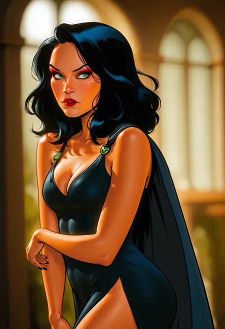 V1:Trigger words: scyllawaifuil, black hair, red lips, green eyes, makeup, eyeshadow, breasts, dress, strap dress, side slit, cleavage, black nails, black dress, high heels, lipstick, black hair